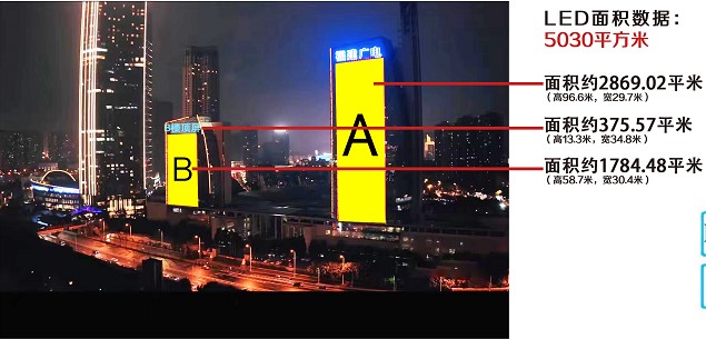 媒體規(guī)格:合計(jì)5030平方米(A樓外立面約2869.02㎡, B樓外立面約1784.48㎡,B樓內(nèi)透屏約375.57㎡)