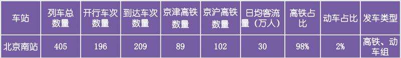 北京南站高鐵數量占比98%,動車數量占比2%。通過對比顯示,北京南站發送列車主要以高鐵列車為主,包含京津城際、京滬線、部分京哈線。