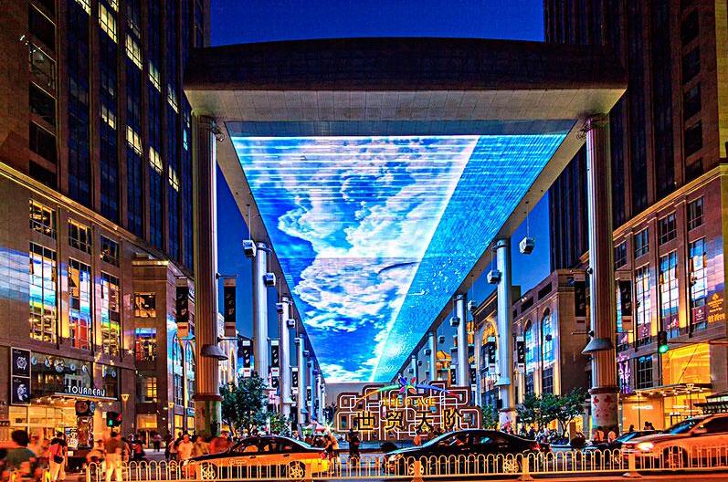 這座天幕將為整條商業街帶來富于夢幻色彩和時尚品位的聲光組合,成為一座吸引人潮的世界級奇觀。建成之后,人們在這里可以欣賞繽紛悅目的日夜景觀,感受現代科技帶來的富于夢幻色彩和時尚品位的聲光藝術。