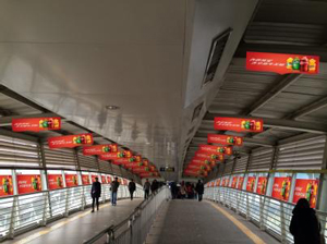 發(fā)布位置:換乘通道天橋?qū)?br />單透貼86塊(104㎡)+吊旗*36+地面層大型看板*2(66㎡)
