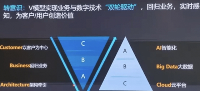 例如,華為在數字化轉型中意識到,數字化轉型是兩個詞,其中數字化是手段,轉型才是目的,轉型具體轉什么?是“五個轉變”:轉意識,轉模式,轉組織,轉文化,轉方法。以轉意識為例,大多數企業談數字化轉型講得做多的是“ABC”:人工智能、大數據、云平臺,而華為認為這些只是技術手段,首先要轉的是意識,即“CBA”:以客戶為中心,業務主導,架構牽引。